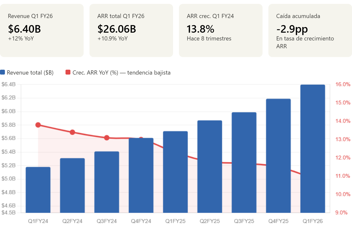 No es una caída, es una desaceleración gradual y la razón por la que vale la pena seguirla de cerca es que el ARR es el mejor termómetro del negocio futuro, mientras que el revenue trimestral refleja contratos firmados en el pasado.