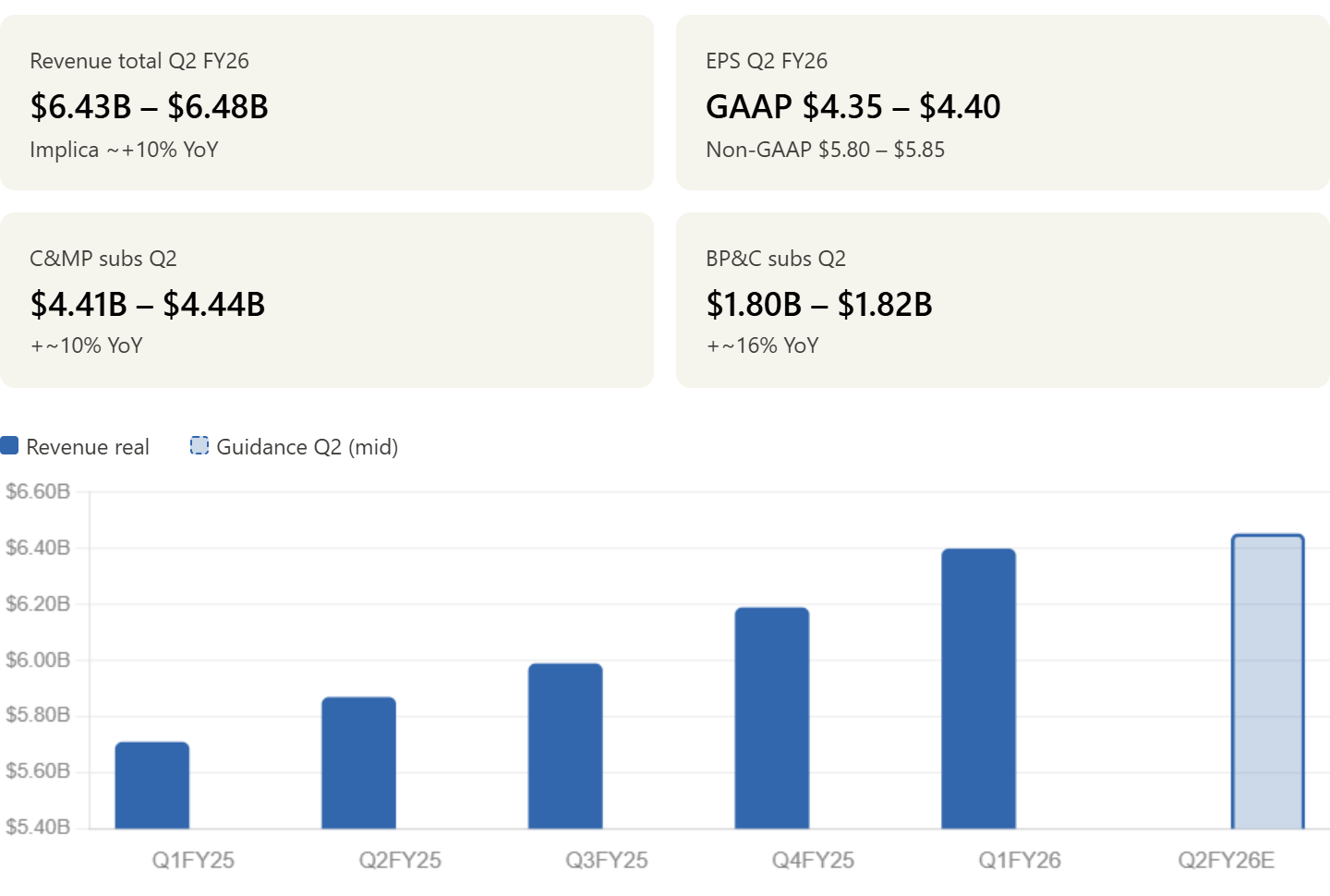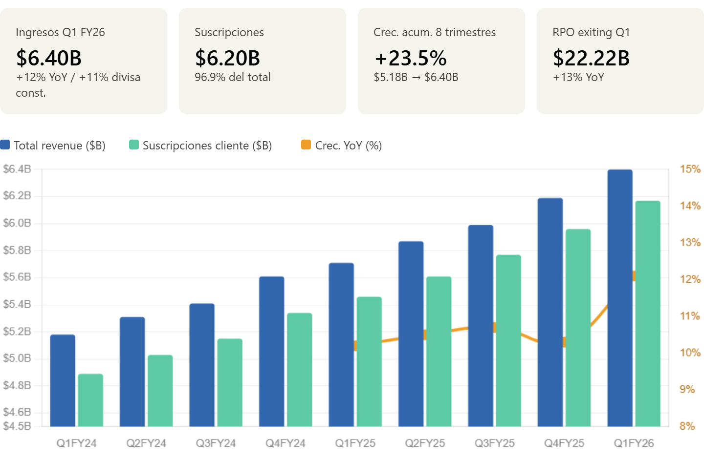 El guidance de Q2 para un revenue de 6.43B a 6.48B implica un crecimiento de aproximadamente el 10% interanual, ligeramente por debajo del 12% del Q1.
