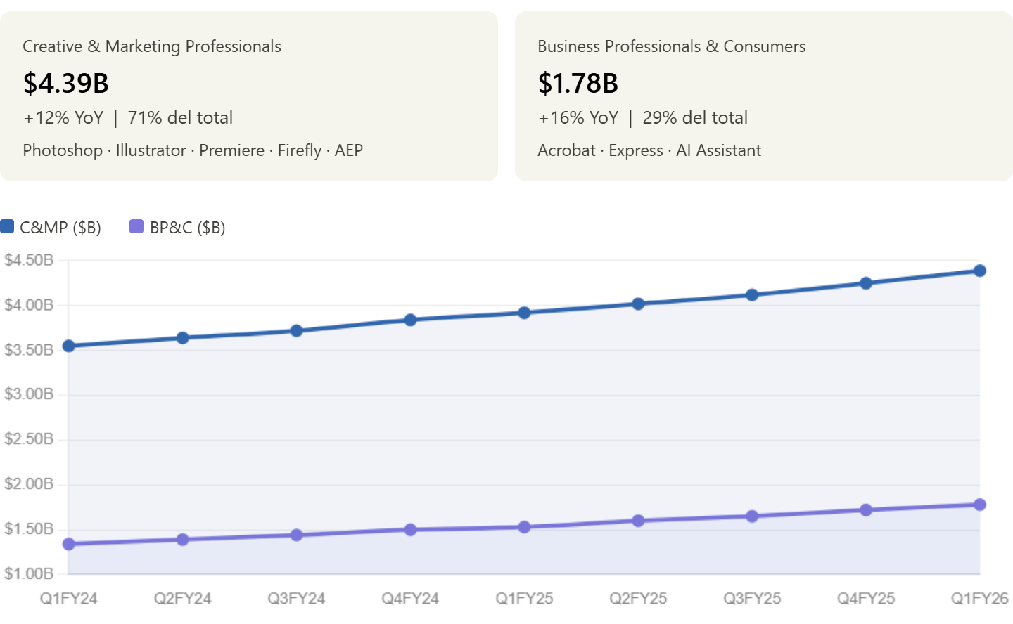 En el segmento creativo, el driver principal sigue siendo Creative Cloud Pro y la explosión de Firefly.